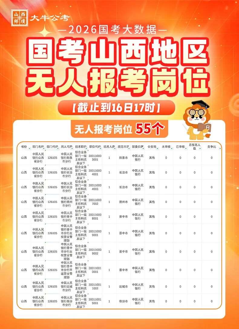 截至到15日17时,国考山西地区无人报考岗位共计55个(共招录71人),没有开始报名的考生可以多多关注这些无人报考的岗位,相对来说,这些岗位会竞争稍弱。