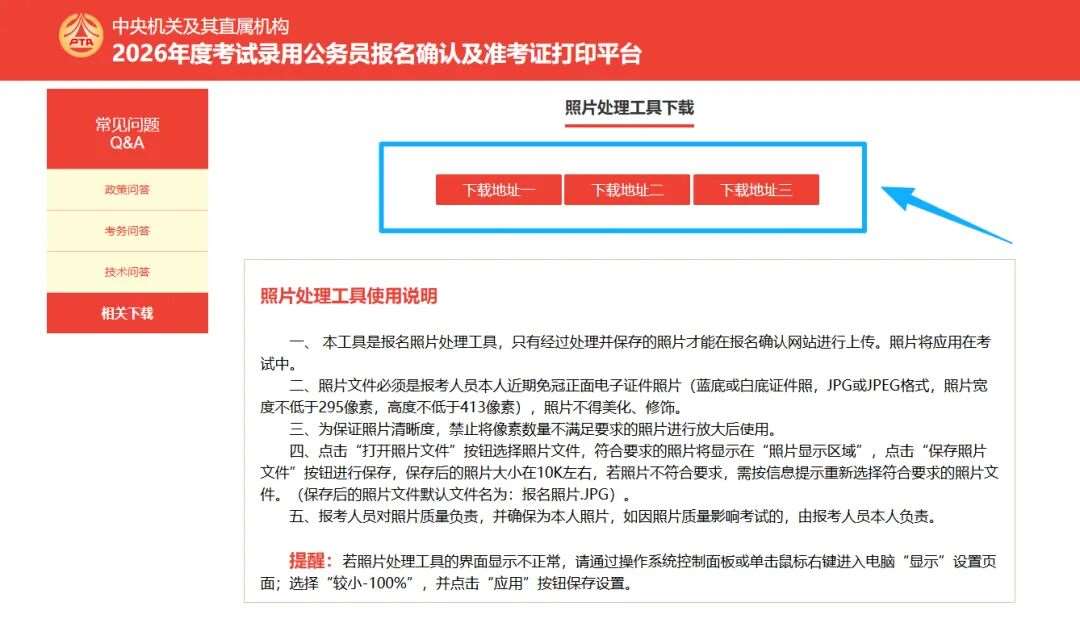 照片处理工具当前已经可以下载,下载方式:①进入官网“考生考务入口”②进入报名确认及准考证打印系统登录页面,点击“点击下载”,选择任一下载地址👇