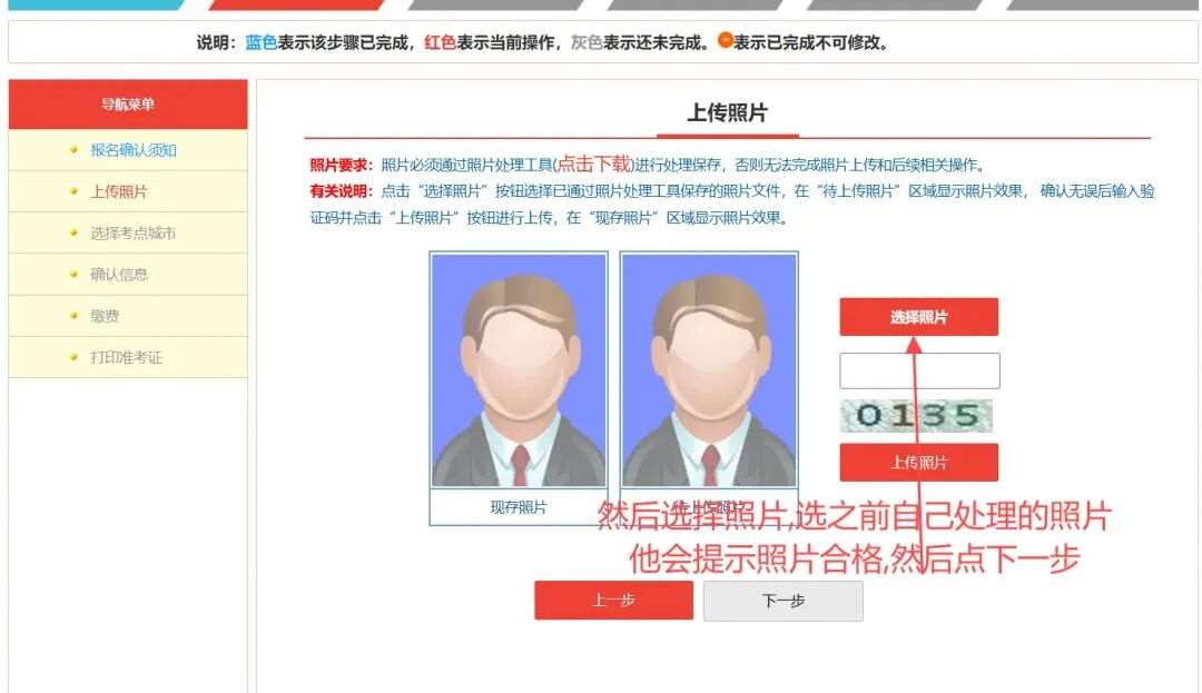 选择处理后的照片,输入验证码,点击“上传照片”,审查通过后进行下一步操作👇
