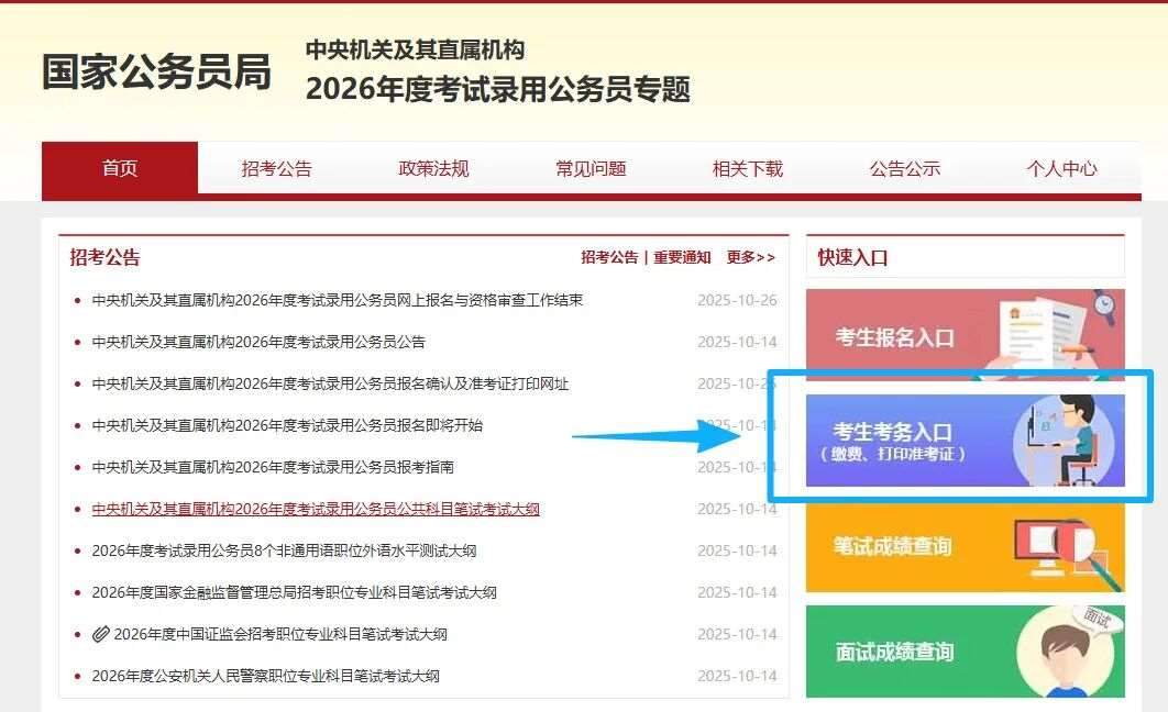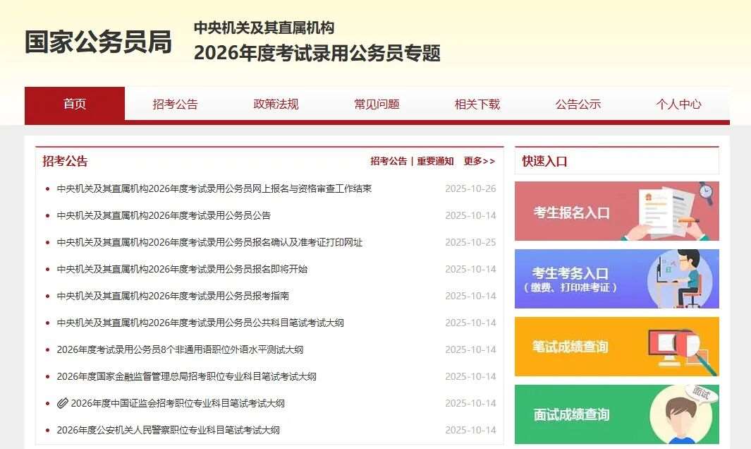 访问国考官网“中央机关及其直属机构2026年度考试录用公务员专题”网站,网络拥挤多刷新几次即可。