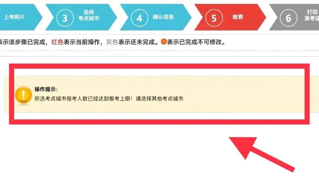 如显示“该考点城市已满,请选择其他考点城市参加考试”,则选其他考点城市上传照片+选考点+缴费👇