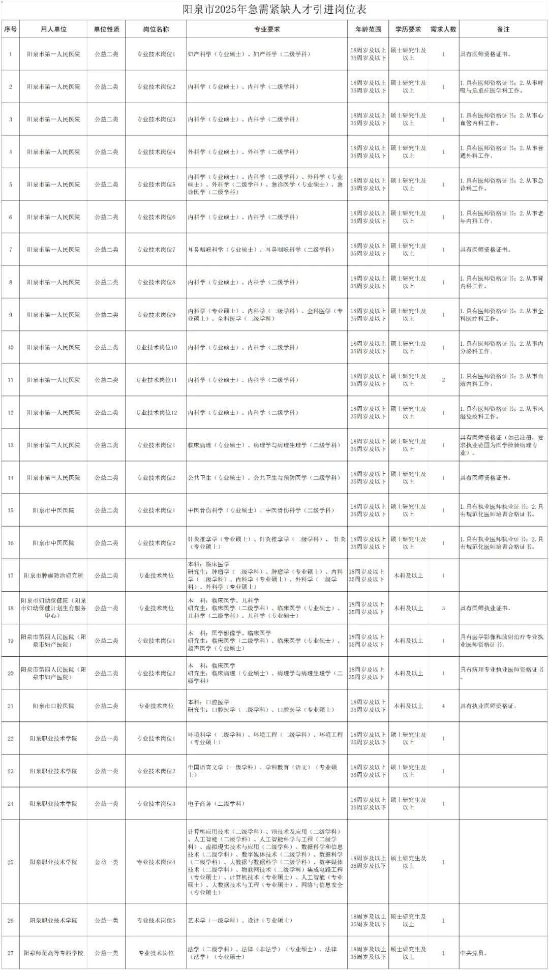 阳泉市市直相关事业单位2025年拟引进急需紧缺人才33名,均为专业技术岗位。引进岗位所需的具体条件详见《阳泉市2025年急需紧缺人才引进岗位表》(附件),以下简称《岗位表》。