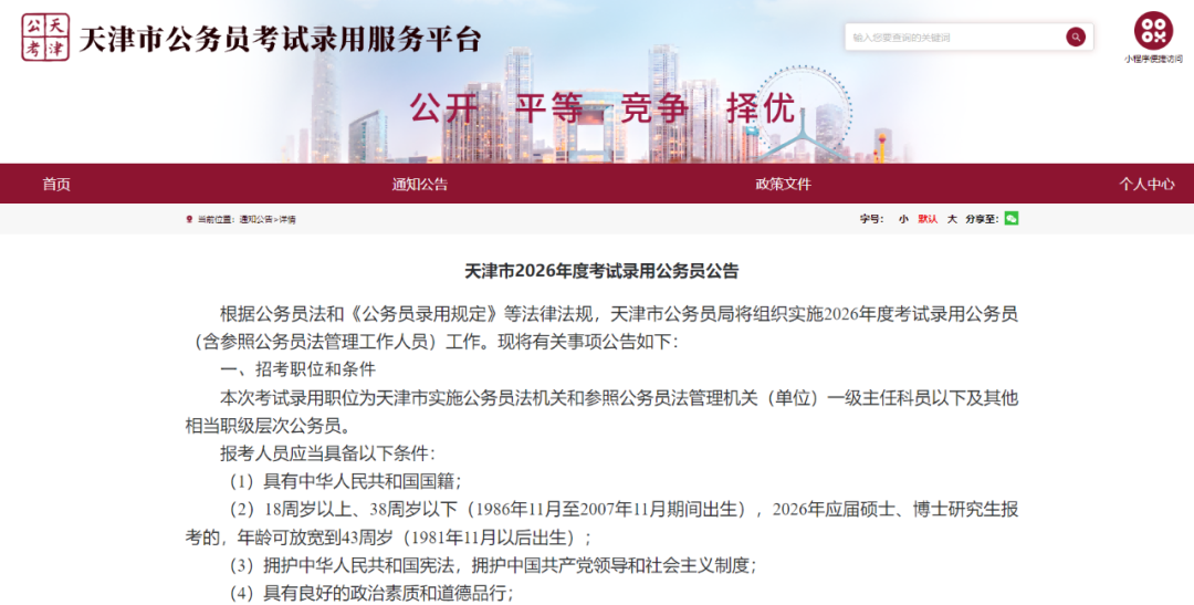 天津市报考年龄放宽至38岁,26年应届硕士、博士研究生放宽至43岁。