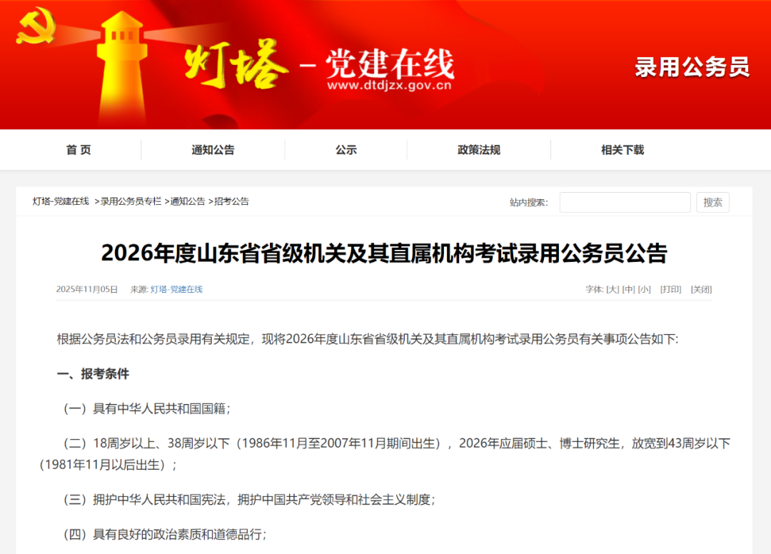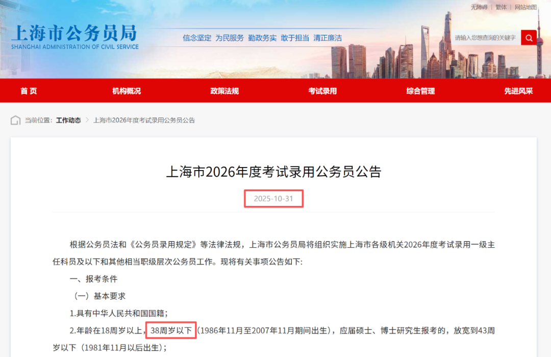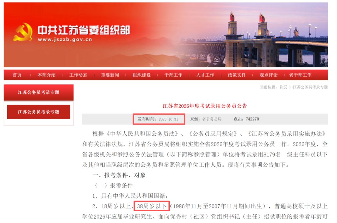 10月31日,江苏省2026考试录用公务员公告正式发布,报考年龄放宽至38周岁。
