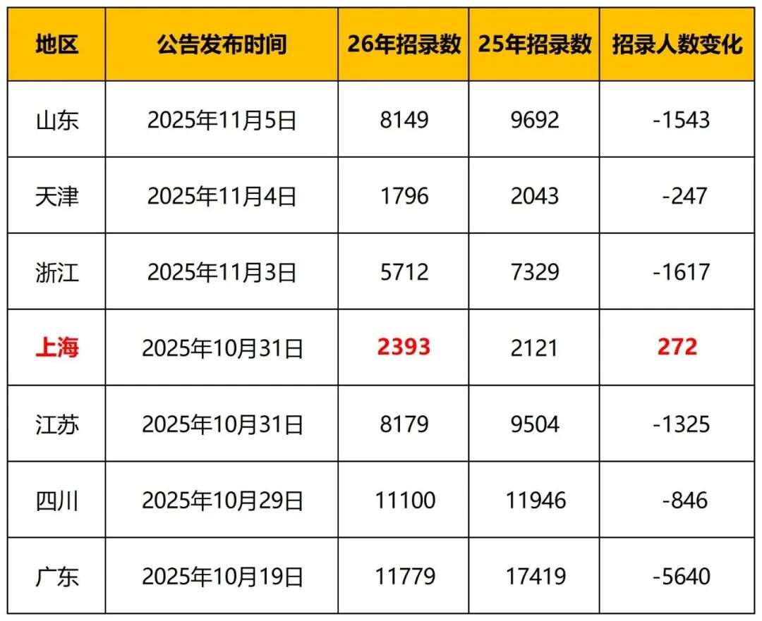 从目前已公布2026年度公务员招考公告的省份数据来看,全国招录规模整体呈现收缩趋势。具体而言,除上海市逆势扩招外,其余6个省份或直辖市均出现不同程度的缩招。
