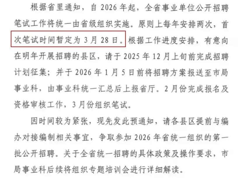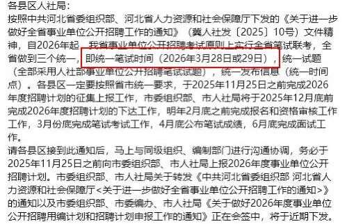 近日网络信息显示,2026年河北省事业单位招聘或将迎来重大变革——计划实行全省统一笔试联考。据相关消息,笔试时间初步定于2026年3月28日或29日,整体招录节奏紧凑高效:预计于2026年2月底前完成全部报名及资格审核工作,3月底前组织完成笔试考试,4月底前公布笔试*。