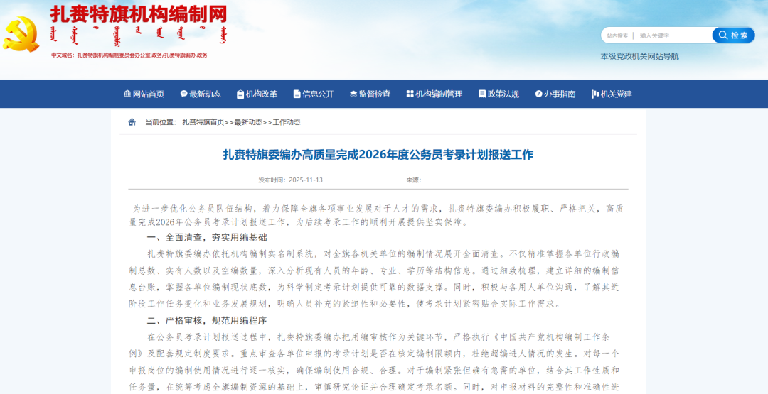 内蒙古扎赉特旗委编办高质量完成2026年度公务员考录计划报送工作,为后续考录工作的顺利开展提供坚实保障。