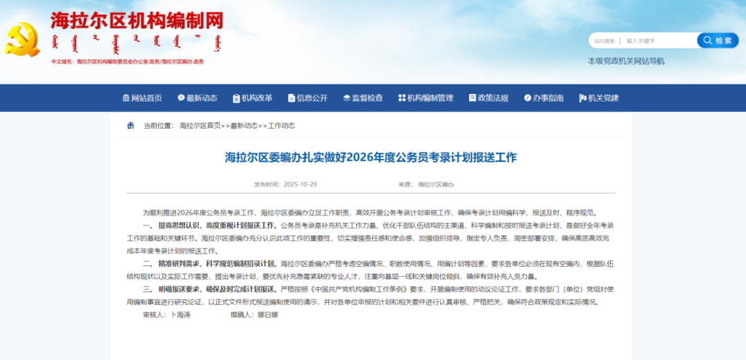 此前,海拉尔区委编办:扎实做好2026年度公务员考录计划报送工作,注重向基层一线和关键岗位倾斜,确保有效补充人员力量。