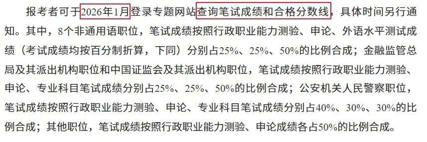 根据2026国考官方公告显示,可以确定笔试*和合格分数线将于2026年1月公布,大家可以提前了解一下: