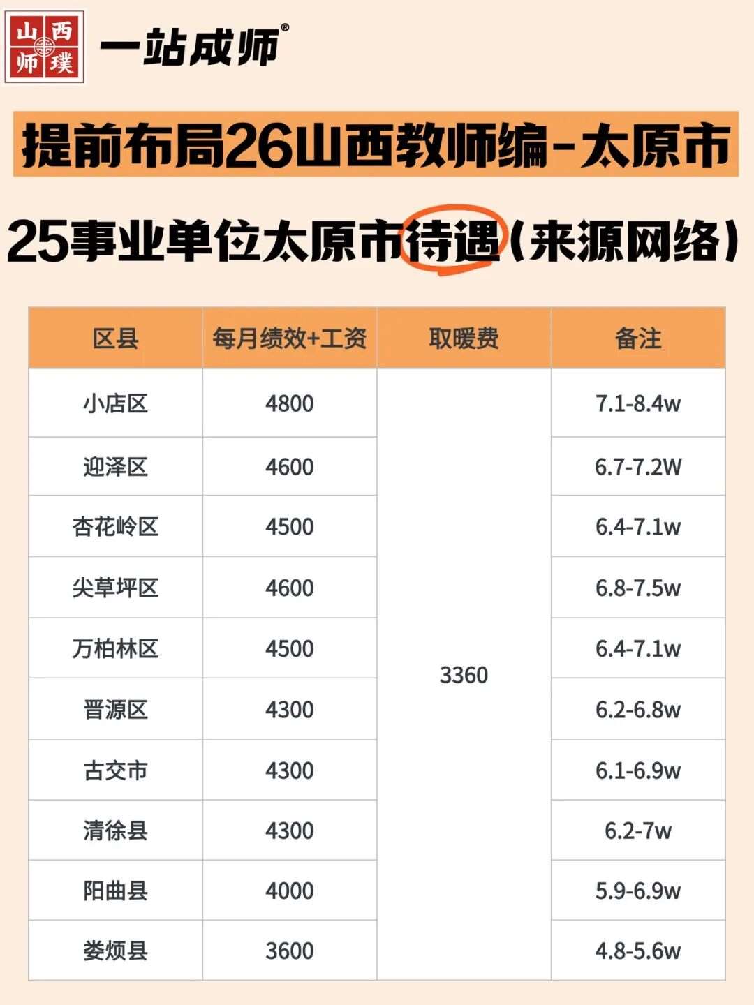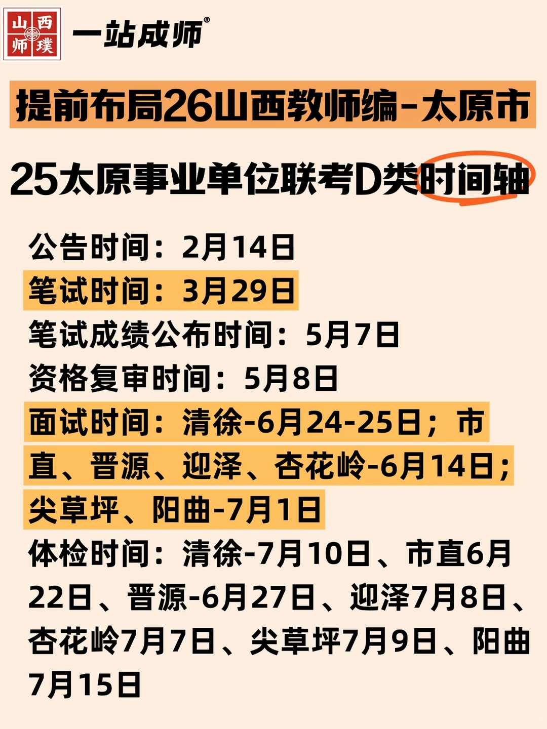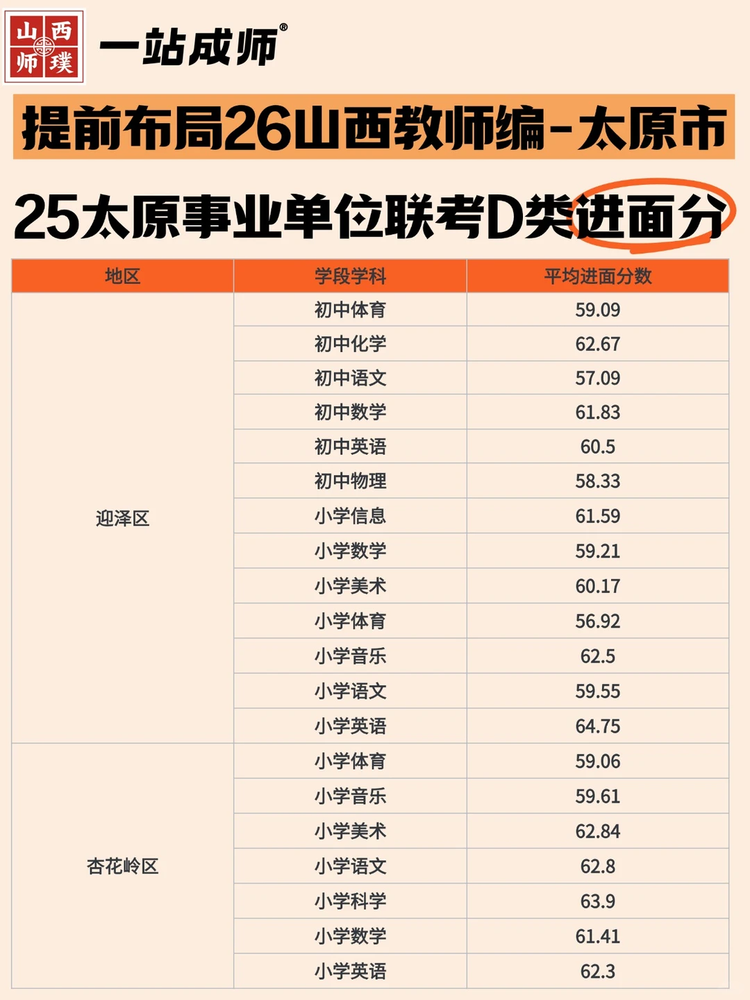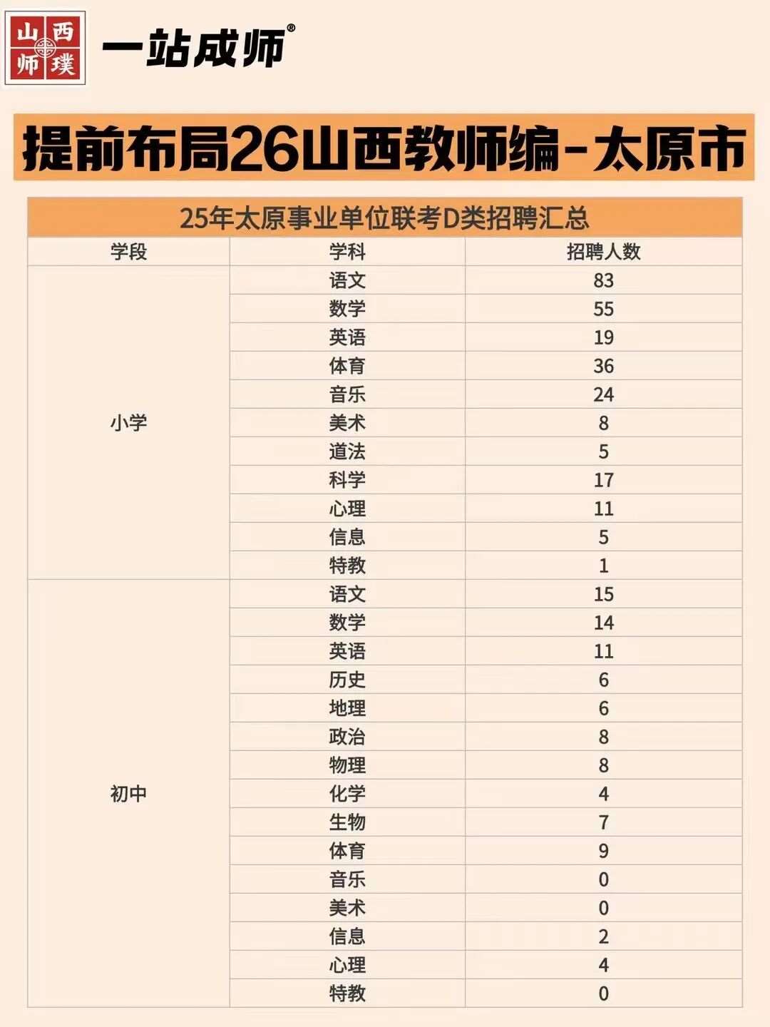 各位宝子们,上篇文章已经带大家一起回顾了25年山西事业单位联考D类教师晋中的考情,今天小编将从各地市各学段招聘人数、重大公告时间轴、工资待遇、进面分数线等几个维度继续给大家分享太原市相关内容!