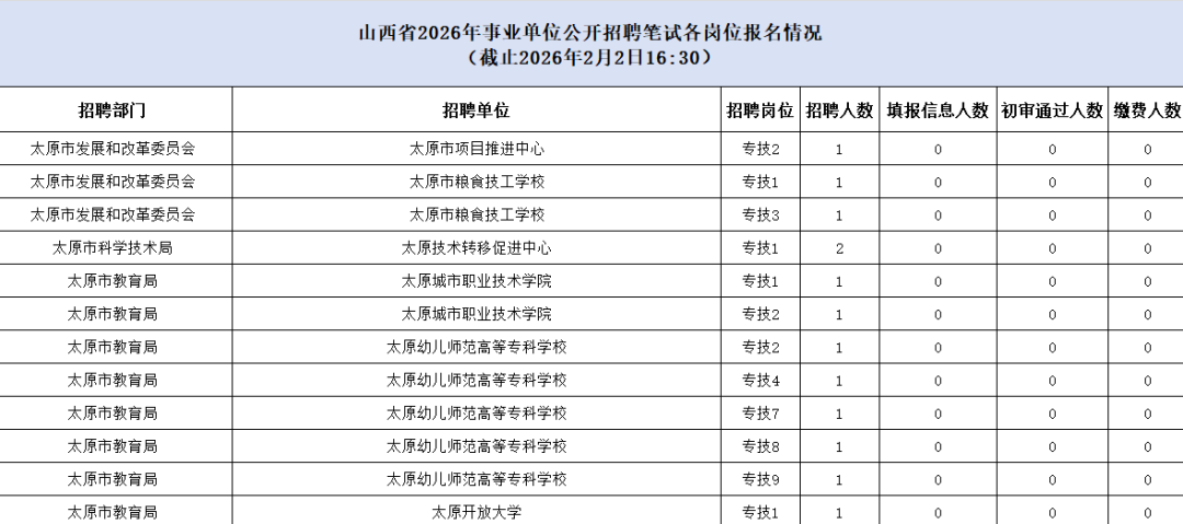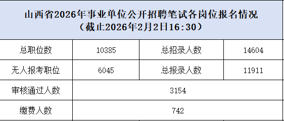 2026年山西事业单位联考提供10385个职位,共计招录公务员14604人。今天是山西联考报名第1天,截至2月2日16:30,全省报名人数达到11911人,审核通过人数3154人,缴费人数742人。