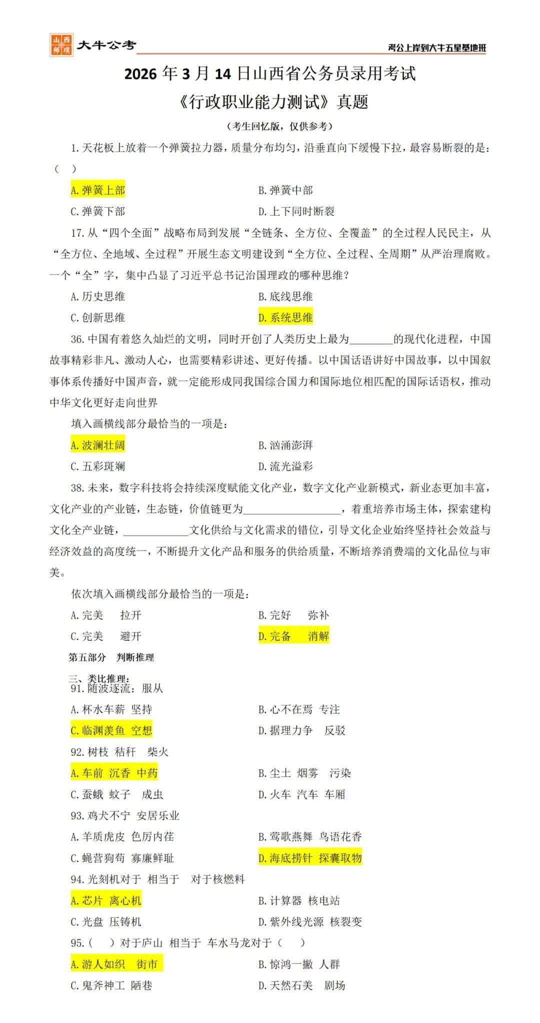 对答案!26山西省考笔试真题及答案(考生回忆版)出炉!